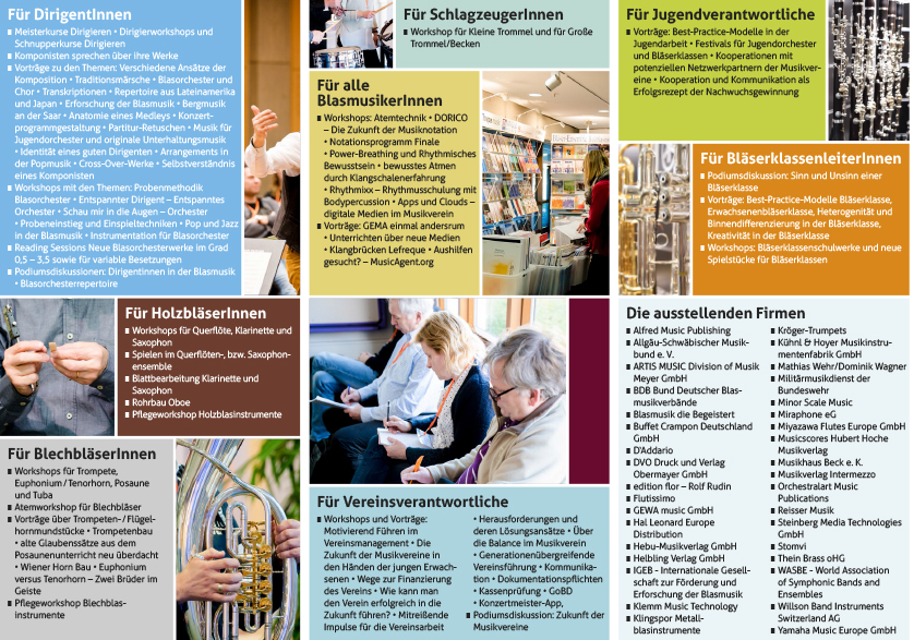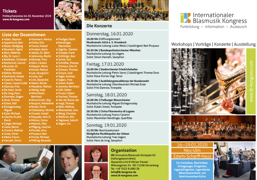 Reportage IBK 2020 90 DozentInnen, 120 Vorträge und Workshops, vier Reading Sessions, drei Podiumsdiskussionen, 36 Aussteller und sieben Konzerte Vom 16. bis zum 19. Januar 2020 findet in Neu-Ulm der zweite Internationale Blas- musik Kongress – kurz IBK – statt. Im Mittelpunkt der Veranstaltung stehen Workshops für Dirigenten mit und ohne Blasorchester, für Mu- sikerinnen und Musiker, Jugendver- antwortliche, BläserklassenleiterIn- nen sowie für Vereins- und Ver- bandsfunktionäre. Insgesamt sorgen 90 DozentInnen aus elf Ländern für insgesamt 150 Stunden Vortrags- und Workshop- programm verteilt auf 120 Angebote in zehn Tagungsräumen des Edwin- Scharff-Hauses in Neu-Ulm. Hauptziel dieses Kongresses ist neben der Fortbildung und der Ver- mittlung von Informationen der Aus- tausch untereinander. Der Interna- tionale Blasmusik Kongress IBK wird wiederum ein Get-Together der Blasmusikszene aus Deutschland, Österreich, der Schweiz und allen angrenzenden Ländern. Zudem fin- den Reading Sessions, in denen die neueste Literatur mit einem Blasor- chester und unter Anwesenheit vie- ler Komponisten vorgestellt werden. In Kurzvorträgen stellen Komponis- ten sich und ihre Werke vor, Auto- ren ihre Bücher und Notenausgaben, Instrumenten- und Zubehörherstel- ler die neuesten Innovationen, Mu- sikwissenschaftler, Dirigenten, Ver- eins- und Verbandsverantwortliche halten Vorträge zu Literatur, Ver- einsmanagement, Marketing, Ju- gendarbeit und vieles mehr. Interessante Podiumsdiskussio- nen sorgen nicht zuletzt für einen regen Austausch. Der IBK für … … DirigentInnen: Folgende Komponisten sprechen 6 Atemtechnik für Blechbläser und ein Pflegeworkshop für Blechblas- instrumente. … alle Blasmusikerinnen und Blasmusiker Workshops mit verschiedenen No- tationsprogrammen, Atemwork- über ihre Werke: Stephan Adam, Bert Appermont, Jacob de Haan, Thomas Doss, Hubert Hoche, Kevin Houben, Carlos Pellicer, Bart Pi- queur, Gerald Oswald, Otto M. Schwarz, Thomas Trachsel, Jan Van der Roost, Mathias Wehr und Satos- hi Yagisawa. Weiter gibt es Vorträge zu den Themen Historische Aufführungs- praxis der großen Traditionsmär- sche, Probenmethodik Blasorchester, Blasorchester und Chormusik, Tran- skriptionen, Blasorchesterliteratur aus Südamerika, Erforschung und Förderung der Blasmusik, Bergmu- sik an der Saar, Anatomie eines Medleys, Retuschen in Partituren, Qualität der Konzertprogramme, Apps und Clouds, Dirigentenausbil- dung, Identität eines guten Dirigen- ten und Arrangements der Popmu- sik. Es wird einen Dirigier-Schnupper- kurs für Anfänger geben, einen Di- rigierworkshop und drei Meister- kurse Dirigieren. Workshops gibt es weiter zu den Themen Unterhal- tungsmusik-Stilistik, Rhythmik, Mentaltraining, Einspielen und er- folgreicher Probeneinstieg. … HolzbläserInnen: Workshops bei Profis gibt es für Querflöte, Klarinette und Saxophon. Weiter gibt es jeweils einen Ensem- ble-Workshop zum Mitspielen für Querflöten, Klarinetten und Saxo- phone. Außerdem stehen die Themen Blattbearbeitung für Klarinetten, Pflege von Holzblasinstrumenten und Oboenrohrbau auf der Agenda. … BlechbläserInnen: Workshops bei Profis gibt es für Trompete, Tenorhorn/Euphonium, Posaune und Tuba. Außerdem ein Blechbläserensemble-Workshop zum Mitspielen, Vorträge über Trompe- tenmundstücke und Trompetenbau, über den Bau von Wiener Hörnern, s n o i t c u d o r P - T P _ 8 1 0 2 @ _ e s s e r P _ K B I : s o t o F s s a V . D ©