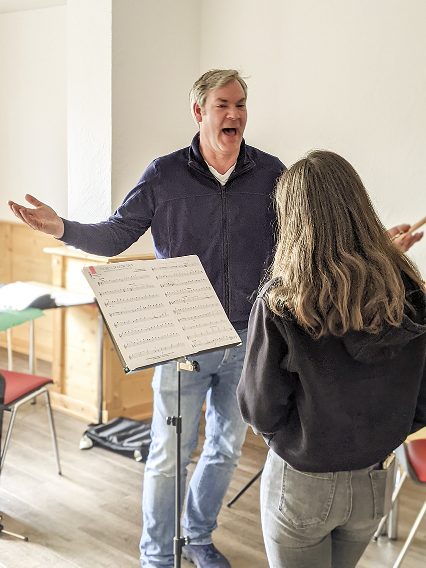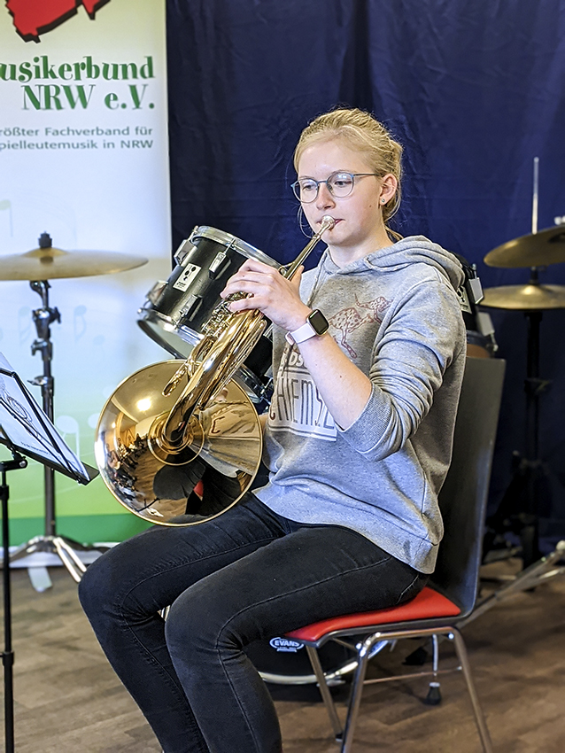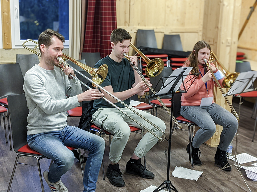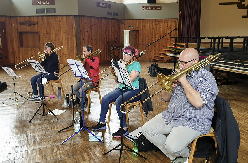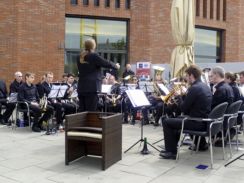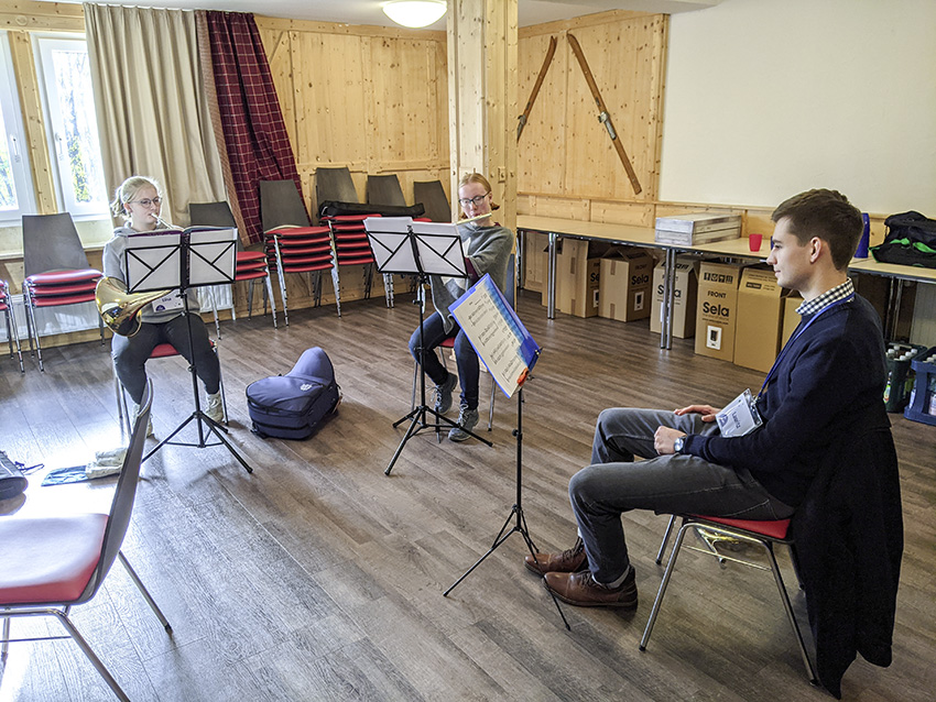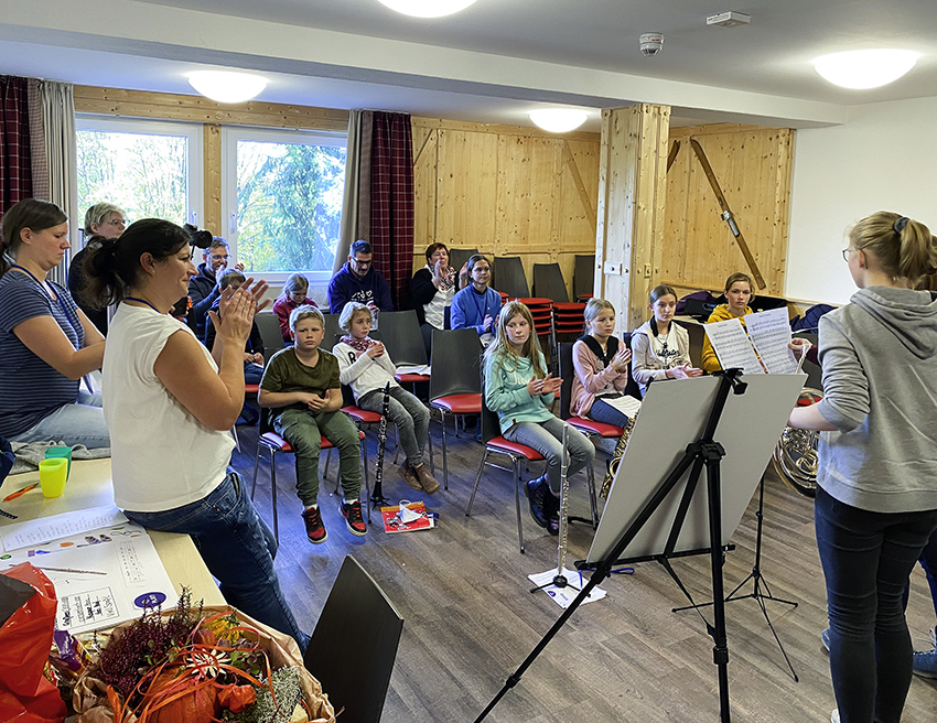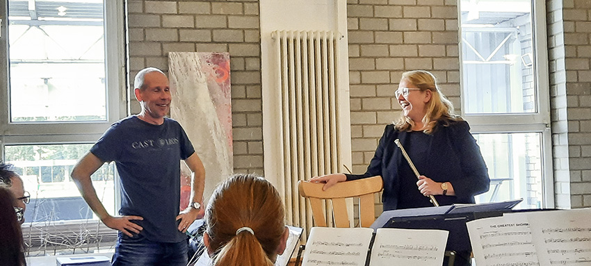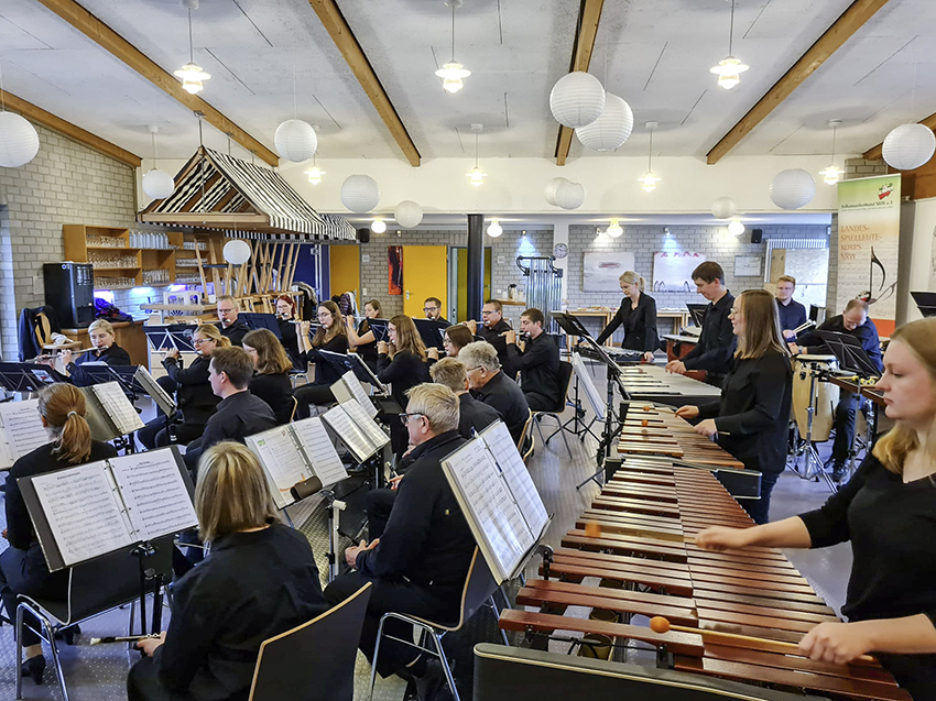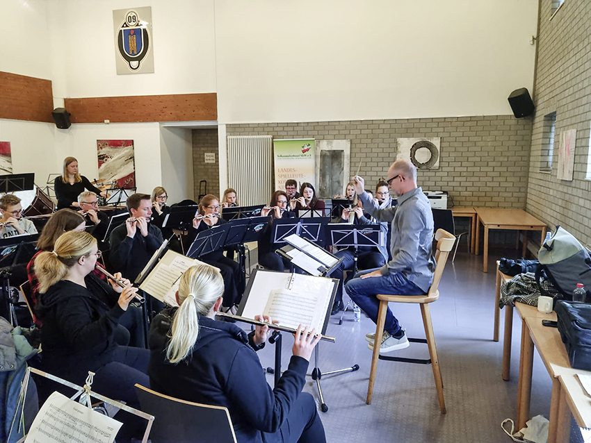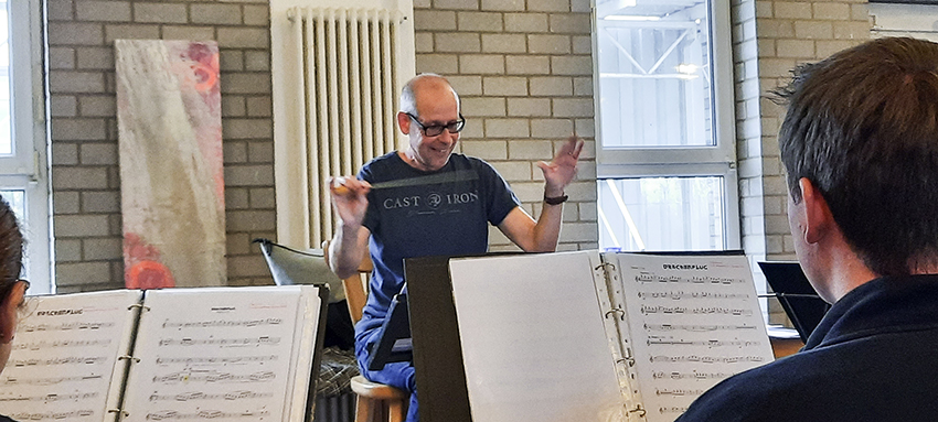 ten Satzes wäre wörtlich mit „Lob- gesang“ zu übersetzen. Es wird ein beschauliches und ruhiges „Loben“, eine Musik, die zum Seufzen und immer wieder Durch- atmen einlädt. Erinnert man sich an den Titel des Werkes, Mandel, ein fließendes Gewässer in Bel- gien, so kann man kleine, ruhige Wellenbewegungen des Flüss- chens durchaus mit den Ohren se- hen. Nach kurzer, viertaktiger Ein- leitung, die Tempo (langsam), Takt (3er) und Tongeschlecht (Moll) de- finiert, entwickelt sich ab A, ei- gentlich über volle 22 Takte, eine lyrische Melodieführung, die nach ihren vier prägenden Eingangs- takten nicht wirklich enden will. A beginnt solistisch in Oboe (bzw. Altsaxophon), zart begleitet vom mittleren und tiefen Blech. Bari- ton (Fagott) ist im jeweils vierten Takt Dialogpartner und Überleiter. Ab B verdichtet sich die ganze Partitur. Die Klarinetten spinnen in Sequenzen das Kopfmotiv wei- ter und bereiten den Weg zu einer (für diesen Satz recht) großen or- chestralen Öffnung (immer noch ohne Trompeten) in C, die vor D in einer „Fragezeichenfermate“ zunächst endet. D greift in verän- derter Instrumentation den Grundgedanken A wieder auf. In E zunächst dito, bevor dann, mit dem Kopfmotiv in den hohen Höl- zern, gestützt vom tief instrumen- tierten Orchester, „Praise“ im zar- ten pp verträumt verklingt. Die Trompeten haben im diesem Satz eigentlich so gut wie nichts zu tun. Ihnen gebührt aber die Ehre, sieben Takte vor Schluss mit Überleitungsmotiv und kurzem Themeneinsatz das Satzende ein- zuleiten. 3. Jubilee In mittlerer Lage beginnen die „Weichklinger“ des Orchesters, gemeinsam mit den Schlagwer- kern, den zunächst bestimmenden rhythmischen Teppich auszurol- len, auf dem sich ab A das erste Thema setzt. Auch dieses, wie im ersten Satz, wird üppiger instru- mentiert wiederholt und die Wie- derholung mit einer kleinen Ge- genstimme angereichert. B bricht dann mit den bislang eher konven- tionell bedienten Erwartungen. Eine Art Zwischenspiel, zunächst harmonisch auf der Dominante mit alterierten Akzenten, später mit Quartschichtungen, erzeugt fragende Spannung, die sich 2 Takte vor D in einem neuen rhyth- mischen Teppich auflöst. D prä- sentiert über zweimal vier Takte ein zweites kurzes Thema, in Moll, stampfend und eher ernst. E greift, minimal nuanciert, „Tep- pich 1“ wieder auf und F bringt das erste Thema zurück, diesmal in den Posaunen (Tenorsaxophon; Fagott). G wiederholt, melodisch geführt von den Hölzern und rhythmisch, harmonisch strenger eingegrenzt von Restorchester, aber noch ohne Trompeten. De- nen ist wieder eine Spezialaufga- be zugeteilt. Im fünften Takt von G (und somit auch im fünften Takt des Themas) beginnen sie, den Rückzug einzuläuten, der im sieb- ten Thementakt, quasi etwas ver- früht, ganz allgemein einsetzt. Fünf Takte vor Schluss erklingt, strahlend, unis und im ff, noch ein- mal der Themenkopf und endet, schlüssig wie zügig, nach kurzen Ritardando-Akkorden in einer Fer- mate. Praktische Hinweise, nicht nur für die/den Dirigentin/en Intrada Eröffnung ruhig, durchaus fan- farenartigen, aber mit mildem ff. Nicht zuletzt, damit die Gegenläu- figkeit der „Basspartie“, beson- ders in Takt 4, differenziert wahr- nehmbar ist. Es ist sicher sinnvoll, dass mf/crescendo Takt 6 einem weichen fp ähnelnd anzulegen. Forte/ben rit. in Takt 6 bei Posau- nen und Trompeten mit dem Ziel Energie für den Tempowechsel anzustauen. 2/4 Takt: Tempo, vor allem „Fluss“ aufnehmen. A: locker fließen lassen, auch bei der klangsteigernden Wieder- holung. Trotz „Verdichtung“ die Nebenstimme erkennbar heraus- arbeiten. B: Artikulation ist Trumpf; sie regelt quasi alles. C: zwei Takt vor C kleinen über- leitenden „Belleffekt“ nutzen, um in C im klar strukturierten Achtel- Sechzehntel-Groove ein „neues Bild“ zu erleben. Dialogisieren von Holz-Blech in D inszenieren, damit sich das Fra- ge- und Antwortspiel in E im Blech auflöst und die Musik mit dem Thema dann klar weiter vo- ranschreitet. F präsentiert im gan- zen Orchester zunächst die erste Themenhälfte. Der dynamische Mix aus forte und mezzoforte hilft nicht zu opulent abzugleiten. Denn, 9 Takte vor Schluss, der im mezzoforte startende „Belleffekt“, die Einleitung zur Schlusswen- dung, benötigt Raum. Noch dyna- misch Luft lassen für den von pia- no bis fortissimo reichenden end- gültigen Schluss in den letzten fünf Takten. Praise Ein ruhiger, fließender Dreier- takt ist der sanfte Motor dieses Satzes. Er sollte als unauffällig treibende Energie immer spürbar sein. A: Die durchaus wellenartige Melodie, geprägt von der auftak- tigen Motivik des eigentlichen Themas, findet spürbar erst in dessen vierten Takt ihren kurzen Ruhepunkt, der aber sofort schon weiterführend „unterspült“ wird vom Bariton (Fagott). Dieses Sze- nario wiederholt sich in den fol- genden vier Takten. B: widmet sich sequenzierend dem Auftaktmotiv (Klarinetten) und überlässt komplementär Ba- riton (Fagott) und Hörnern die Aufgabe, den „Schwung“ nicht zu verlieren. C: Verhältnismäßig große or- Fachberichte chestrale Öffnung, ebenfalls in Se- quenzen. Die dritte Sequenz endet „fragend“ in einer Fermate. Wie geht es weiter? Da wir uns bitte im mf befinden und auch noch ein decrescendo haben, sollten wir keine zu große Dramatik verspre- chen. Alles ist gut. Nur ein wenig träumen. D: greift in veränderter Instru- mentation (Solist: Bariton (Fa- gott)) die Grundstimmung A wie- der auf. Im vierten Takt schleichen sich die Trompeten mit dem Über- leitungsmotiv sanft ein. Nach Übergabe an die Klarinetten, füh- ren sie dann in den Schluss, den die hohen Hölzer, gestützt vom Altsaxophon, vollenden. Jubilee Nach „Groove-Bestimmung“ in den ersten vier Takten die Dyna- mik sowieso, besonders aber diese in der Begleitung, absenken. Die Rhythmik sollte gefunden sein. Sie erhält nun ihren Fluss durch ar- beitsame Konsequenz, weniger durch zu ambitionierte Dyna