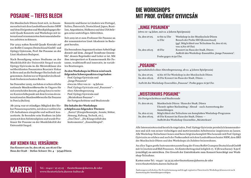 Fachberichte dieser Artikel dazu beiträgt den Leser ein Stück näher auf „seinen eigenen Weg“ zu bringen. Andreas Michel Zu 5: Clarke Technical Studies, no. 27-44, second study: Verschie- bung des Legatobogens. Zu 6: Beispiel Haydn Konzert für Trompete Es- Dur, die es´´´- Stelle: Beginnend ab c´, aufsteigend bis zur Originalstelle. Im Folgenden noch einige Übun- gen aus meiner Schatzkiste, die ich auf meine eigenen Bedürfnisse abge- stimmt habe. Die No- tenbeispiele dazu ste- hen im Kasten links. Übung 1: Intervall- übung, Akzente beach- ten Übung 2: Anstoß, Geläufigkeit, Variabi- lität, piano und ele- gant ausführen. Übungen 3 und 4: Flexibilität, Mimik be- obachten, muss ruhig bleiben. Übung 5 und 6: Si- cherheit, Tonumfang, piano und forte aus- führen. Und beim Üben bitte nie vergessen Locke- rungsübungen einzu- schieben und … im- mer schön locker blei- ben. Im Laufe des Le- bens erhält man viele gute Ratschläge- sie können helfen oder auch nicht. Doch ei- nes ist sicher: „Suchst Du nach ei- ner hilfreichen Hand, findest Du sie am ehesten am Ende Dei- nes eigenen Armes.“ Ich hoffe sehr, dass www.jupiter.info info@andreas-michel-musiker.de Andreas Michel ist ein hochgeschätzter klassischer Trompeter und absolvierte sein Studium an der Musikhochschule in Heidelberg-Mannheim mit dem Abschluss Dipl.-Orchester Musiker. Er nahm u.a. Konzerttätigkeiten in folgenden Orchestern: Nationaltheater Mannheim, Freie Kammer- sinfonie Baden-Württemberg, Trompetenensemble ARTA, Philharmonie Baden-Baden, Staatstheater Stuttgart, Staatstheater Karlsruhe, Würt- tembergische Philharmonie Reutlingen, Orchesterakademie unter Professor Helmuth Rilling. Darüber hinaus ist er Musikschulleiter der Jugendmusikschule Pforzheim GmbH. 26.-29. Mai 2022 MMeeiisstteerrkkuurrssee,, WWoorrkksshhooppss,, KKaammmmeerrmmuussiikk uunndd KKoonnzzeerrttee mmiitt mmiitt MMaarriioo CCaarroollii,, HHeennrriikk WWiieessee,, AAnnnnaa DDiinnaa BBjjøørrnn--LLaarrsseenn,, KKaarrll KKaaiisseerr,, IIaann CCllaarrkkee uu..aa.. wwwwww..bbddbb--aakkaaddeemmiiee..ccoomm//qquueerrwwiinndd 16.-19. Juni 2022 MMeeiisstteerrkkuurrssee,, WWoorrkksshhooppss,, KKaammmmeerrmmuussiikk uunndd KKoonnzzeerrttee mmiitt SSaaaarr BBeerrggeerr,, JJoosséé VViicceennttee CCaasstteellllóó,, CChhrriissttoopphh EEßß,, CChhrriissttiiaann LLaammppeerrtt,, FFeerrgguuss MMccWWiilllliiaamm,, SSaammuueell SSeeiiddeennbbeerrgg uu..aa.. wwwwww..bbddbb--aakkaaddeemmiiee..ccoomm//hhoorrnniissssiimmoo